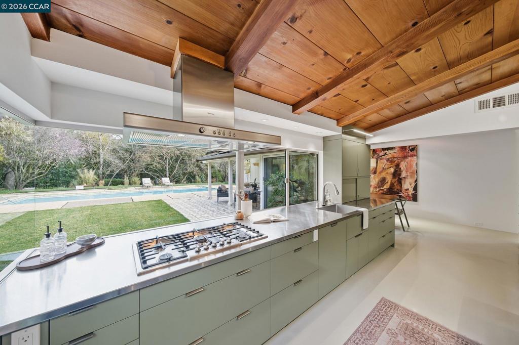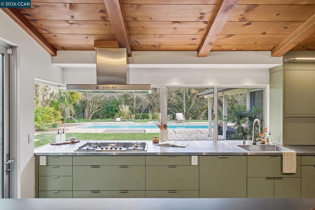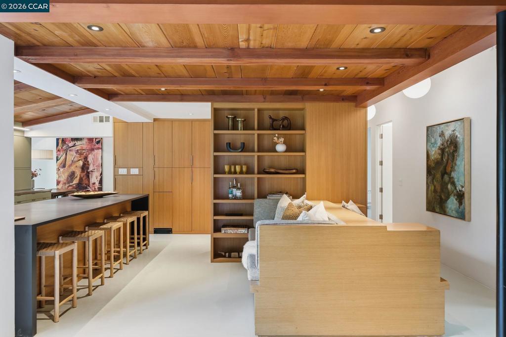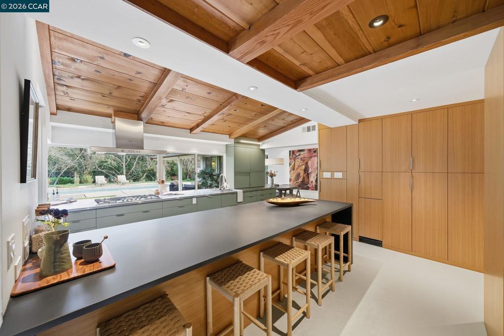 Iconic mid-century home, remodeled in 2015 into an effortlessly cool and quintessentially California retreat. This one-of-a-kind masterpiece sits on a verdant, half-acre lot in the heart of Lafayette’s prestigious Happy Valley and offers privacy, great design, and seamless indoor-outdoor living. The flexible floorplan includes 4 bedrooms, 4 baths, a dedicated office, and separate living, dining and bonus rooms. High-end custom finishes elevate every space with top-of-the-line appliances (Thermador, Bosch and Sub-Zero), Fleetwood windows and doors, radiant heating, IPE decking, and an eco-conscious grey water recycling system. Designer, epoxy resin flooring creates a luminous and seamless architectural finish that is both durable and chic. Custom cabinetry with sleek honed slate countertops adds depth and texture to the kitchen and bathrooms. Every detail has been carefully selected to celebrate the home’s mid-century roots while embracing modern luxury and sustainability. The lush, private backyard has an inground pool with separate hot tub and is ideal for entertaining. This exceptional property is all within easy reach Lafayette’s vibrant downtown, convenient commute routes, the Lafayette Reservoir, Oakwood Athletic Club and top-rated schools.