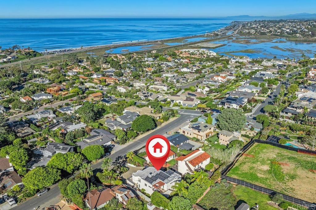 Nestled on a secluded cul-de-sac, this custom contemporary home is located in one of Solana Beach’s most coveted locations. Offering privacy and mesmerizing sunset and whitewater ocean views, the unique layout includes 3 bedrooms plus a den, and large storage area. The main living spaces are bright and open, with a wall of windows and doors that showcase the views. The kitchen includes a built-in Sub-Zero refrigerator and views from the sink that will have you asking… what dishes!? The expansive primary suite is a private sanctuary with even more stunning coastline views, a fireplace, balcony, large primary bath, massive walk-in closet, and adjacent room perfect for a home office or nursery. On the first level, enjoy a convenient bedroom and full bath, powder bath, laundry room, and an extra-large storage area ideal for converting to an ADU or Jr. ADU. Out back, you’ll find a lush yard with real grass, with plenty of space to add a pool, putting green, or play structure! Multiple patios invite alfresco dining, entertaining, and private spaces to escape to, including a terrace with jacuzzi. Efficient features include owned solar, an electric car charger, and gated side parking—perfect for your Sprinter van, boat, or toys! Overflow parking is a dream with an oversized 4-car garage and a large driveway. The location is truly idyllic: just blocks from the beach, scenic lagoon trails, local elementary school, and vibrant Cedros Design District’s world-class shops, restaurants, and Coaster Station. This home is a rare coastal gem offering space, privacy, and stunning ocean views!