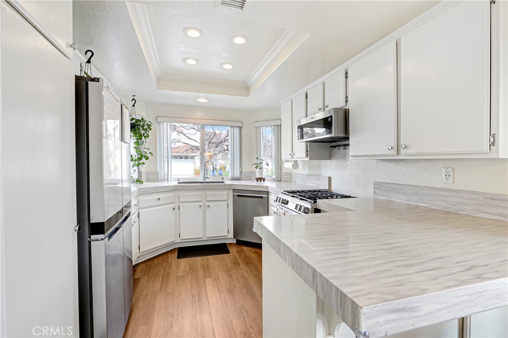 Beautifully maintained single-story residence, with large front yard leading to entrance, on a private corner lot, with solar and a whole-house fan for energy efficiency and year-round comfort. Features warm and brand new laminate flooring and an abundance of natural light throughout. The upgraded kitchen with Recessed lighting and stainless steel appliances, flows effortlessly into the dining area and living room with fireplace, creating a bright and inviting space perfect for entertaining. Sliding glass doors open to a hardscaped backyard with built in BBQ designed for relaxing, barbecuing with friends, or planting that vegetable garden you’ve always imagined. With three private bedrooms with lots of closet storage, and two bathrooms all on one level, this home offers comfort, functionality, and easy living. Additional highlights Beyond the home itself, the lifestyle here is truly unmatched. The HOA offers resort-style amenities including pools, a beach club and lagoon, clubhouse, access to beautiful Rancho Santa Margarita Lake, parks, pickleball and tennis courts, basketball courts, baseball fields, a splash pad, plus vibrant community events and clubs for all ages. Outdoor enthusiasts will love being close to O'Neill Regional Park and the area’s extensive network of hiking and biking trails. Known as one of California’s safest cities, Rancho Santa Margarita offers a charming small-town feel with quiet neighborhoods, a strong sense of community, and a super family-friendly atmosphere. Surrounded by beautiful mountain views, you’ll feel worlds away from the hustle and bustle of busy Orange County — yet still conveniently close to everything you need. This isn’t just a home — it’s a lifestyle. Welcome home.