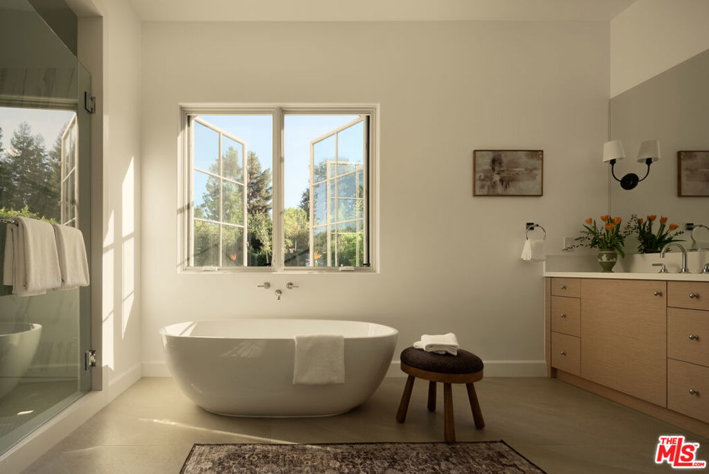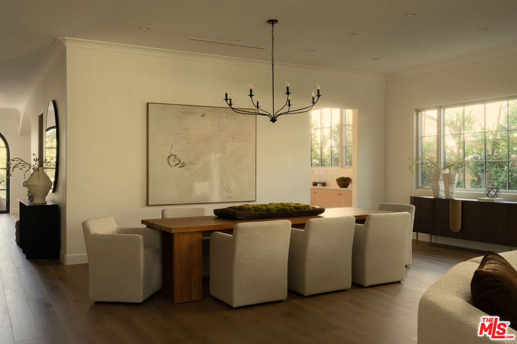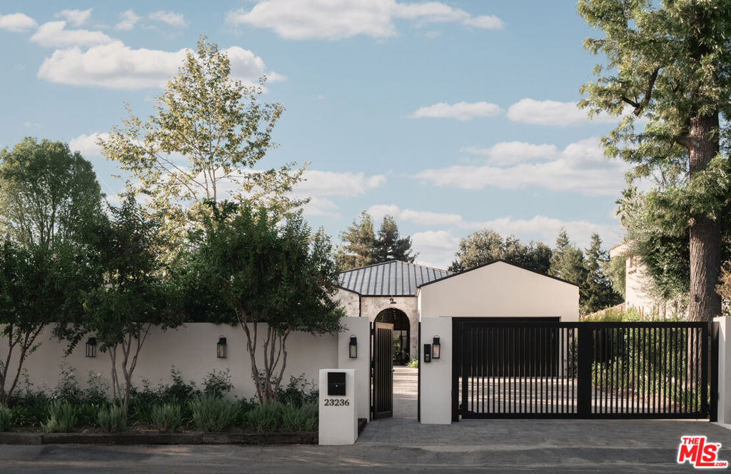 Welcome to this gated, 2025 single-story modern farmhouse compound in Walnut Acres Estates, newly finished with beautiful materials and set back from a tree-lined street with a pickleball court, an abundance of outdoor gathering space, and sparkling pool and spa. The home's cobblestone and soft stucco facade blends natural elements to form a serene, welcoming environment for all to enjoy. Guests arrive into a sizable motor court amidst carefully placed drought-tolerant landscaping and cozy sitting areas under shade trees. Through a beautiful curved glass-paned front door, visitors discover high ceilings, warm woods, and organic hues throughout, calming the senses. The living room is centered by a stone fireplace flanked by thoughtfully designed built-in book cases that continue the home's casual, artistic vibe. The kitchen is grand and elegant, with custom cabinetry, state-of-the-art appliances including a commercial-grade range with smartly designed hood plus pot filler, and oversized center island. The adjacent butler's pantry perfectly connects to the formal dining room for catering and entertaining. Nearby is a glass-encased wine cellar, as attractive as it is functional, and a plush theatre/screening room for movie nights at home. A series of arched windows lines the hall to the owner's wing. Here, sliding glass opens to gardens and patios for effortless indoor-outdoor living. The primary bath is large, with a dual-sink vanity, soaking tub, and rainwater shower adjacent to the walk-in wardrobe with custom built-ins. Secondary bedrooms are also en-suite, and one is currently utilized as an office. Privacy hedges surround the backyard, with its variety of spaces to relax, recline, and converse, including a covered outdoor living room, al-fresco dining area, and barbecue with prep sink and bar ledge. Enjoy the shimmering waters of the pool and spa, roam and play on the grassy lawn, or challenge friends to a game of pickleball or basketball on the sport court. Effectively new construction and never before lived in, this is the place where memories are made! Welcome to an ideal location close to parks, schools, houses of worship, and the 101 Freeway, just moments to the Calabasas Commons, Westfield Topanga and Village, and upcoming Rams Village at Warner Center. Also located within the attendance boundaries of top-rated Woodlake Avenue Elementary School.