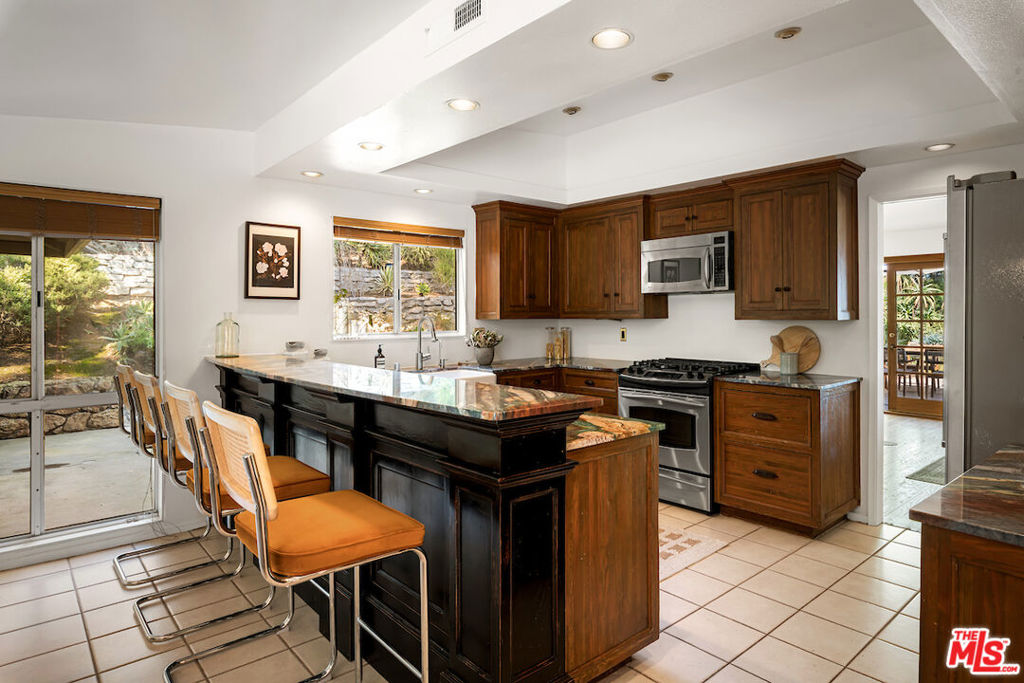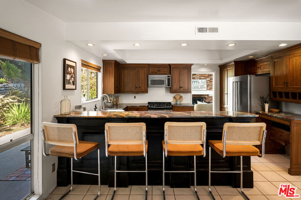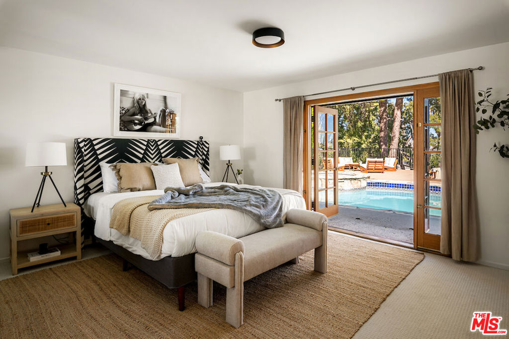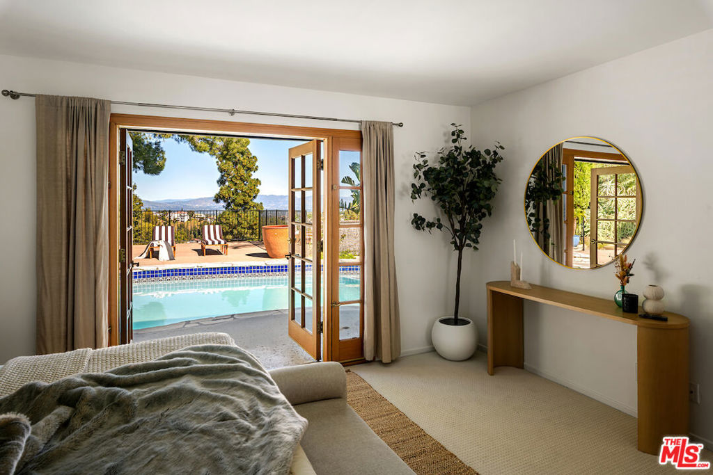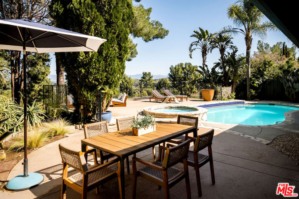 Nestled in a quiet cul-de-sac street in an upscale neighborhood of Woodland Hills, adjacent to Topanga Canyon, this charming single-story ranch offers privacy, space, and sweeping valley views. This beautifully maintained 3-bedroom home features a thoughtful, open layout designed for both everyday living and effortless entertaining. The spacious kitchen with gorgeous Brazilian Quartz countertops offers eating at the island or dining in the attached dining room making entertaining a dream. Head to the living room with French doors that open to an expansive backyard seamlessly blending indoor and outdoor living while showcasing breathtaking panoramic views. The spacious primary suite is a true retreat, complete with French doors leading directly to the serene pool deck, a wall of closets, and an en-suite bath appointed with travertine tile and striking black stone countertops. Two additional light-filled bedrooms share a bright full bathroom. In addition to the main living areas, the partially converted garage provides flexible bonus space plus a separate office ideal for today's work-from-home lifestyle. A detached artist's studio tucked below the pool deck offers even more creative or guest potential. (Bonus areas are not included in the square footage.) Set on a generous lot, the property offers multiple outdoor spaces to enjoy: a side yard with a grill conveniently located off the kitchen, a large driveway with ample room for parking or recreation, and an incredible backyard designed for entertaining. Lounge on the expansive deck, relax by the pool and spa, and take in the stunning valley vistas and mountains. Just minutes to scenic hiking trails, Topanga Beach, Calabasas Commons and Westfield Topanga Mall. This is California living at its finest. Plus, great schools in the area! Don't miss your chance to see this special home!