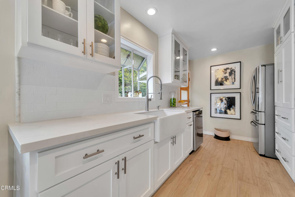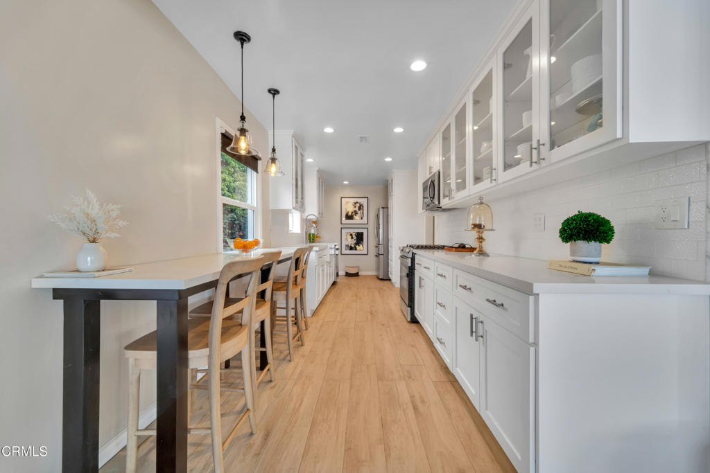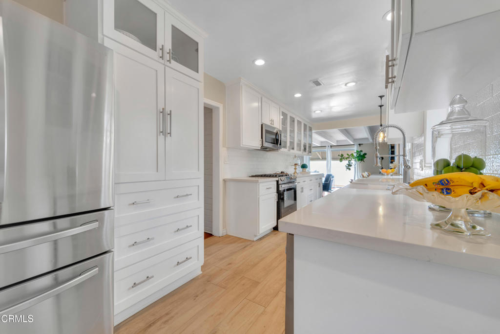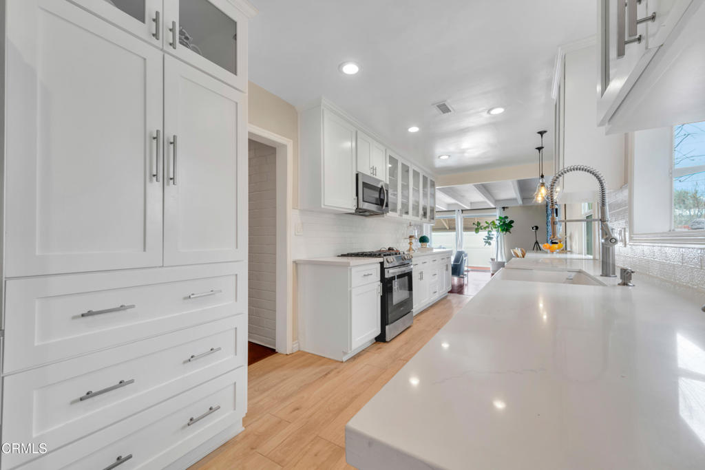 Welcome to 6931 Gazette Avenue, a beautifully updated Mid-Century Modern POOL HOME nestled in the heart of Winnetka! This stylish residence blends timeless architectural character with thoughtful modern upgrades, creating the perfect balance of comfort and design! The single level floor plan offers 3 bedrooms, 2 full bathrooms, and 1,650 sq. feet of living space. The upgraded kitchen is absolutely beautiful and features sleek Shaker style cabinets w/glass fronts, quartz counter tops, decorative tile backsplash, farmhouse sink, decorative lighting, and stainless steel appliances that stay with the home! Both bathrooms have been tastefully updated including the primary en suite, which has dual sinks, large tiled shower, modern fixtures, and durable wood like tile floors! Other highlights of the home include 2 fireplaces, modern paint tones, dual pane windows, central heat & AC, and a great light-filled sunroom with large windows! The low maintenance backyard has a sparkling in-ground pool & large deck area, perfect for enjoying the Southern California weather! The home is situated in a quiet neighborhood, and is ideally located just minutes from Westfield Topanga Shopping Center, The Village, Pierce College, fine dining restaurants, and just a short drive to the 101 freeway. Don't miss out on this exceptional opportunity!