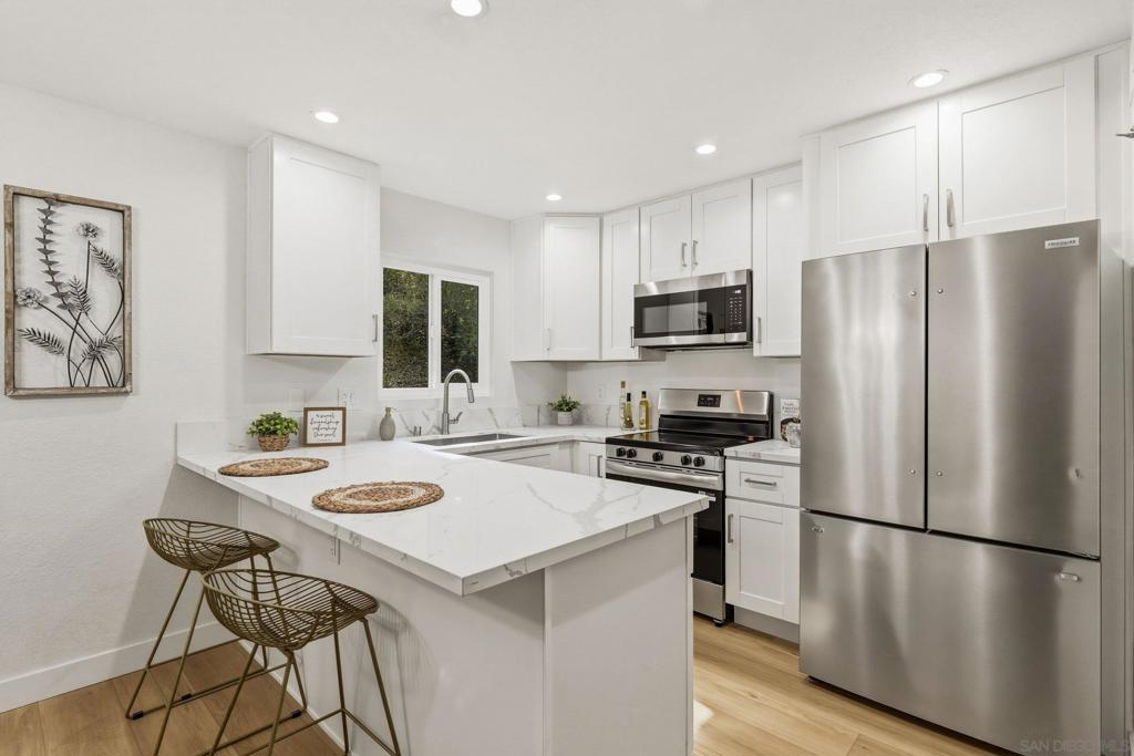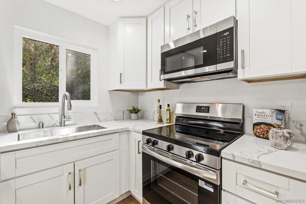 Completely remodeled and truly turnkey, this stunning residence showcases a stylish, modern renovation with luxury vinyl plank flooring throughout. The beautifully redesigned kitchen features custom cabinetry, quartz countertops, and brand-new appliances, along with new fixtures, sink, hardware, and lighting. Remodeled in February 2026, this move-in ready condo is ideally situated in a quiet, private location within the Falls Community, positioned at the rear of the complex with no unit directly behind, offering enhanced privacy and serene greenery views. Additional upgrades include a newly tiled fireplace surround, a fully remodeled bathroom with a dual-sink vanity, new fixtures, mirrors, tub, tiled shower, and toilet, as well as a freshly painted interior including ceilings and brand-new baseboards. The spacious bedroom offers a generous walk-in closet. Brand-new double-pane doors and windows provide energy efficiency and abundant natural light. Exceptional opportunity to own one of the most beautifully updated and competitively priced one-bedroom homes in 92127. Community amenities include two pools, two spas, a clubhouse, and tennis courts. Patio pavers create an expanded outdoor living space perfect for relaxing or entertaining. Ideally located just minutes from shopping, dining, and freeway access, the Falls Community is surrounded by scenic walking paths, mountain views, and well-maintained single-family neighborhoods.