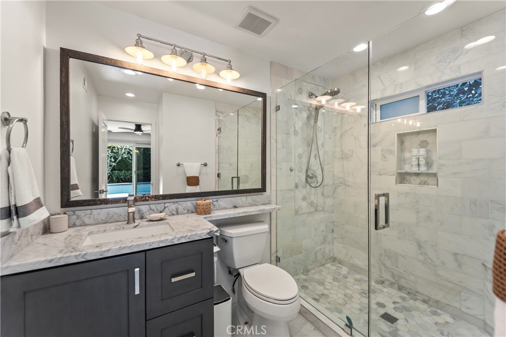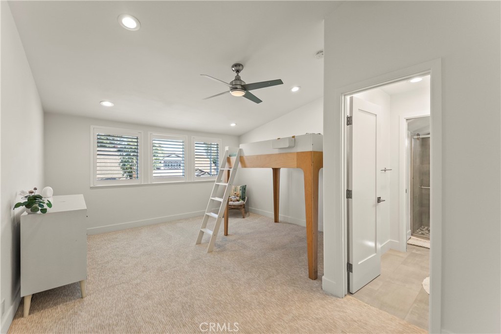 Welcome home to 2705 Starbird, located in the highly sought-after Upper Birds of Mesa Verde on a quiet cul-de-sac, adjacent to Tanager Park and just moments from the Costa Mesa Country Club. This fully reimagined coastal transitional retreat offers 5 bedrooms, 4.5 bathrooms, and approximately 3,005 square feet of refined living designed for both elevated entertaining and everyday comfort. Flooded with natural light, the home seamlessly blends modern sophistication with relaxed California style, highlighted by wide-plank wire-brushed oak floors, oversized windows, and plantation shutters throughout the open-concept main level. The chef’s kitchen serves as the centerpiece, featuring crisp Shaker cabinetry, quartz countertops, polished Carrera subway tile, an expansive island ideal for gathering, a 48-inch five-burner range with griddle and double ovens, and a built-in 42-inch counter-depth refrigerator. Retractable accordion doors create seamless indoor-outdoor flow to the private resort-style backyard with a sparkling pool, lounge areas, and enhanced privacy fencing. The versatile layout includes three ensuite bedrooms—one downstairs, one upstairs, and a spacious primary retreat overlooking the park with a spa-inspired bath showcasing dual vanities, a frameless rain shower, and designer finishes. Thoughtful upgrades include a centralized smart-home control system for indoor/outdoor audio, pool features, and security, newer HVAC with A/C and Nest thermostat, newer electric panel, WiFi optimization throughout, custom closet systems, electric Hunter Douglas shades, and abundant built-in storage. The home is equipped with solar and designed for energy efficiency, complementing the EV charger in the 3-car garage along with a Flow Wall organization system and dedicated workspace. Offering an exceptional blend of design, technology, efficiency, privacy, and location in one of Costa Mesa’s most desirable neighborhoods, this incredible Mesa Verde residence truly has it all!