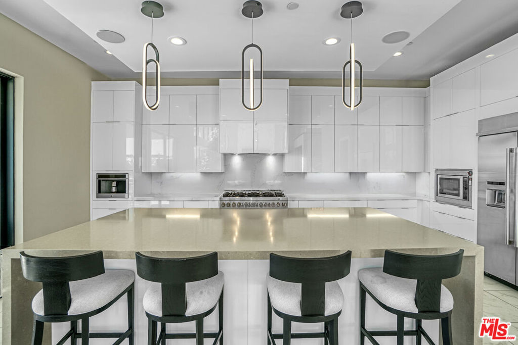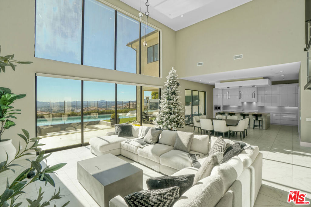 Discover this elevated modern luxury estate set within the prestigious 24-hour guard-gated community of Westcliffe in Porter Ranch Hills. Completed in 2022 and positioned on a premium view lot, this residence captures breathtaking panoramic city and mountain views from nearly every corner of the home including the Primary Suite .A dramatic solid wood and glass entry door opens to soaring 24-foot ceilings and an airy, light-filled floor plan. Expansive windows and oversized stackable doors create a seamless connection between the Great Room, the chef's kitchen, and the outdoor living spaces, flooding the home with natural light and highlighting its sleek modern design.The gourmet kitchen features designer appliances, a large stone island, modern cabinetry, and a generous entertaining space. The main level also includes a spacious Great Room, a versatile office/media room, and a private guest bedroom with a full bath.Upstairs, the Primary Suite offers a luxurious retreat with incredible views, a spa-inspired bathroom with dual vanities, a rain shower, and a soaking tub. Four additional bedrooms and a flexible loft complete the upper level, providing ample room for family and guests. Designed for resort-style living, the backyard is an entertainer's paradise featuring a sparkling pool and spa, a dramatic water-wall feature, a sunken fire pit, and a fully equipped outdoor kitchen with stainless-steel BBQ. Multiple dining and lounging areas, surrounded by manicured landscaping, create the perfect setting for gatherings or private relaxation.Additional highlights include solar panels OWNED , high-end finishes throughout, and a three-car garage, rounding out the home's exceptional functionality and design.Ideally located near The Vineyards shopping center, Whole Foods, AMC, award-winning schools, and the 118 freeway, this estate offers modern luxury, elevated lifestyle, and some of the most breathtaking views in all of Porter Ranch!