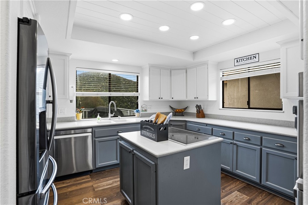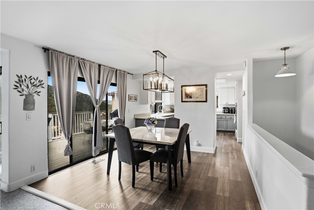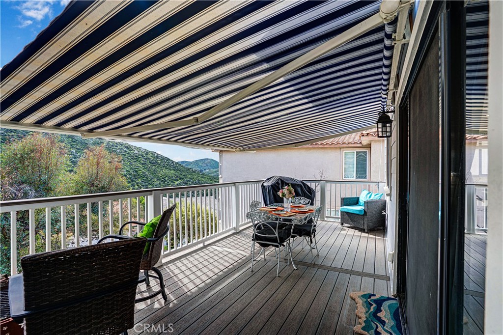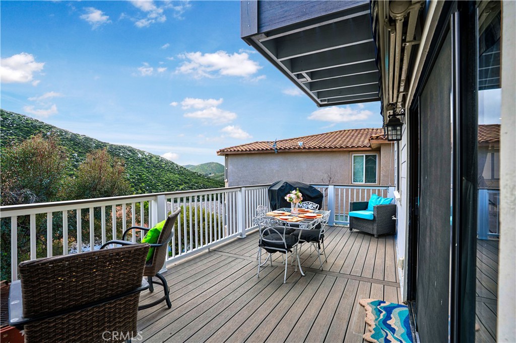 INCREDIBLE Mountain and golf course VIEW!! 4 Bedroom 4 bathroom home with just under 2700SF of living space including a lock-out studio ADU ON THE LOWER LEVEL with a full kitchen and 4 person SAUNA room. Walk in to a dramatic high ceiling entry and a large living room with connected dining space near the kitchen. One of the bedrooms is located on the main level and is currently being used as an office. Upstairs you will find the additional bedrooms including a large primary bedroom suite with jacuzzi tub and spacious walk in closet with built in dressers and shelving. The laundry is also conveniently located on this level. On the bottom level, the ADU space has its own oven, microwave, sink and refrigerator as well as a bathroom and versatile living space. This "mother-in-law/ Multi-Gen" space has a separate entrance and AC unit and may have possible income generation potential! In the main house, enjoy a whole house fan, a newer AC unit and an automatic roller shade on the main deck. New ceiling fans, fixtures and flooring have recently been updated as well as new underlayment for the roof replaced in 2026. Enjoy your privacy and view on the 3 trex decks over looking the backyard and canyon. The 2.5 car garage also has additional space for a golf cart and has a new garage door opener system. Canyon Lake is a gated golf and lake community with parks, a country club, events and activities each month, an equestrian center, ski lakes, baseball field, dog parks, pickleball, basketball courts, tennis courts, a lakeside campground and so much more. The Lighthouse Restaurant & Bar offers indoor and outdoor dining and event space right beside an Olympic-sized pool, sandy beaches and a play area. Near the community you can hike, bike, shop and enjoy the best of the Southern CA lifestyle! (BUYER TO VERIFY ALL)