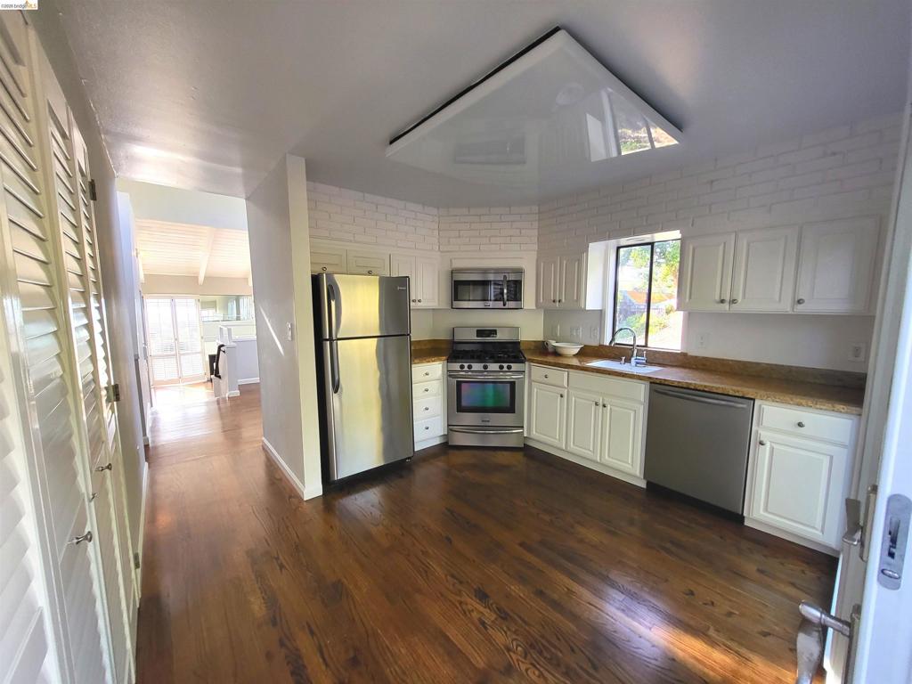 Views, views, views of the San Francisco Bay! Updated 2-bedroom, 2-bath townhome with a private and sunny loft, ideal as a 3rd bedroom or home office. A living room with a fireplace, a separate dining room with vaulted ceilings, an updated kitchen with granite counters and stainless steel appliances, a 2-car garage with interior access, ample storage, and a workshop. Common areas include a swimming pool and lush grounds. Close to Pinto Ranch Recreation Area, Leona Heights Park, McCrea Park, and the Oakland Hills Pool and Tennis Club, shopping, and easily accessible to Highway 13 and 580, and the Oakland International Airport. Views: Downtown