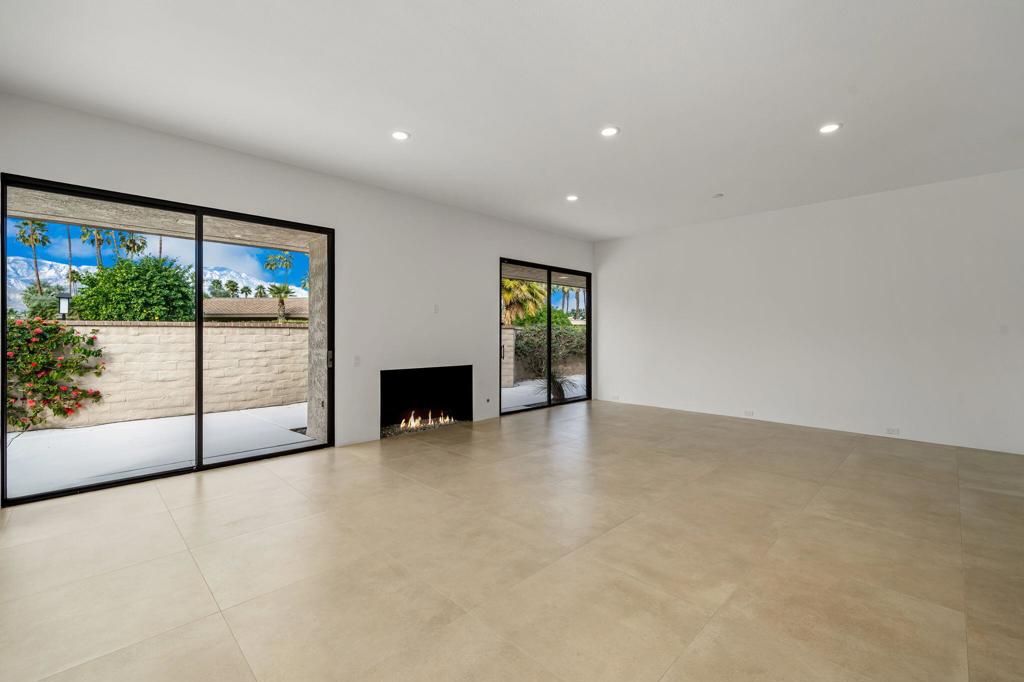 Welcome to this meticulously renovated stunner inside the Iconic Springs Country Club. This 3-bed, 3 1/2 bath home is a highly sought after free-standing St. Andrews model, but with a new powder room off the front entry. Located on a generous sized lot with a very large turn-around driveway, this 2847 sf beauty (appraiser-measured) is the perfect desert retreat for those seeking high-end finishes, soothing desert hues, and a very quiet location. Enter through the double glass custom gates into a large front courtyard adorned with a newly resurfaced sparkling saltwater pool/spa and stunning west views of the snowcapped mountains and swaying palm trees. The large wrap around patio features fragrant foliage, mature citrus trees and succulents, and has plenty of room for entertaining and relaxing with friends and family. Whether you're enjoying stories around the built-in firepit to feasting on your favorite cuisine prepared on the built-in grill & wet bar w/granite countertops, dining alfresco will always be in style! Once inside the double glass entry doors, you're greeted with luxurious finishes, including 32 x 32 porcelain tile flooring throughout. The large great room/dining area, featuring a clean-line fireplace, soaks in an abundance of natural light, and offers fantastic west views of the snow-capped mountains, overlooking the relaxing pool area. Enter a chef's dream kitchen that includes state-of-the-art appliances; a professional Dacor oven/cooktop and Bosch D/W. The center of the kitchen shows off a full-slab quartz island, perfect for those family gatherings in the kitchen. Enjoy double wine refrigerators, custom Dayton-Rift cabinetry and soft-closing drawers, all topped with carmel and ivory quartz slab. The luxurious Primary suite is adorned with natural light and shares captivating views of the San Jacinto mountains. A triple frosted glass door closet and add'l large walk-in closet mean you'll always have room for those last-minute desert shopping sprees. The 5-star Primary bathroom offers a deep solid-surface soaking tub. All three bedrooms are ensuite and feature Brizo shower hardware that truly elevates your bathing experience. Add specialty shower tile surfaces and Taj Mahal quartz countertops & Dayton-Rift cabinetry, and you have a true spa experience. The garage floor has a new epoxy finish and large storage room. A new security system, new water softener system and OWNED solar panels make this home a rarity and MUST SEE!
