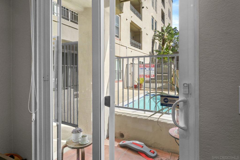 Have it all and live steps from everything you love about San Diego in this stylish ground-floor residence at Villa Portofino in the heart of Bankers Hill! Designed with a breezy coastal feel, this appealing home includes high ceilings and thoughtful upgrades throughout. The open kitchen shines with granite counters, refinished cabinetry, tray ceiling, and a double oven with microwave, perfect for home chefs. Recessed, dimmable LED lighting, Hunter ceiling fans, crown molding, and a custom fireplace mantle add warmth and character, while double-pane windows and custom patio sliders with pool view enhance comfort and efficiency. This is a gated building. The spa-inspired bath features a jetted Jacuzzi tub and rain showerhead, plus a Washlet bidet toilet. The spacious bedroom offers a generous closet, and the in-unit, full-size washer and dryer provide maximum convenience. Modern touches such as custom shades and blinds, pull-down patio shade, and automatic laundry and closet lighting elevate everyday living. From your private patio, enjoy direct, no-step access to the pool, spa, BBQ area, and outdoor lounge. This upscale community is gated throughout and includes a well-equipped gym facility. Two deeded parking spaces—a rare perk for a one-bedroom—add exceptional value, along with 3.8% assumable VA loan. Walk to Balboa Park and Little Italy’s exceptional dining, and reach downtown, Hillcrest, and the airport in minutes. This is effortless urban living with resort-style perks right outside your door. Your next chapter starts here! Furniture can convey.