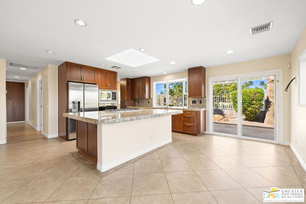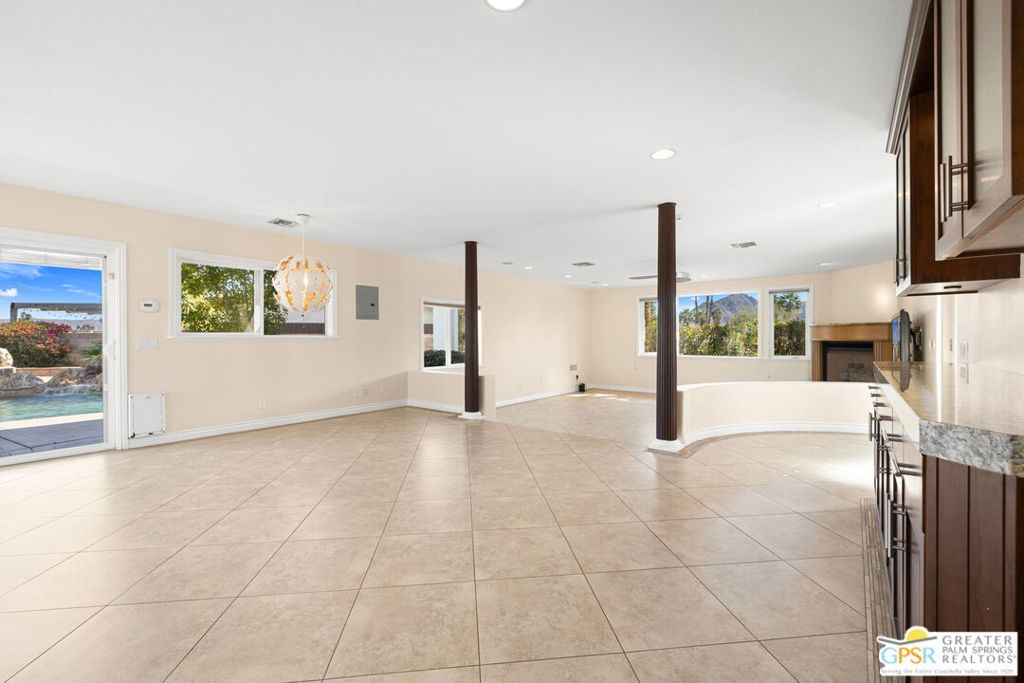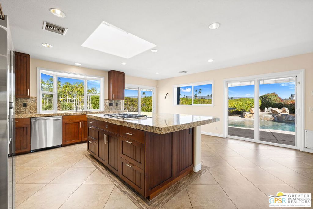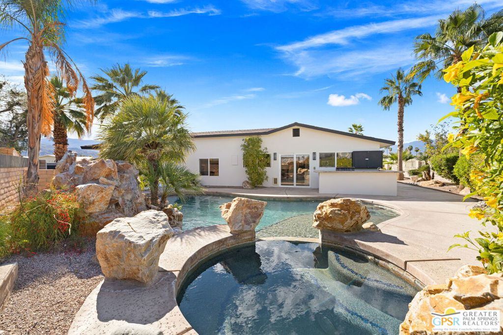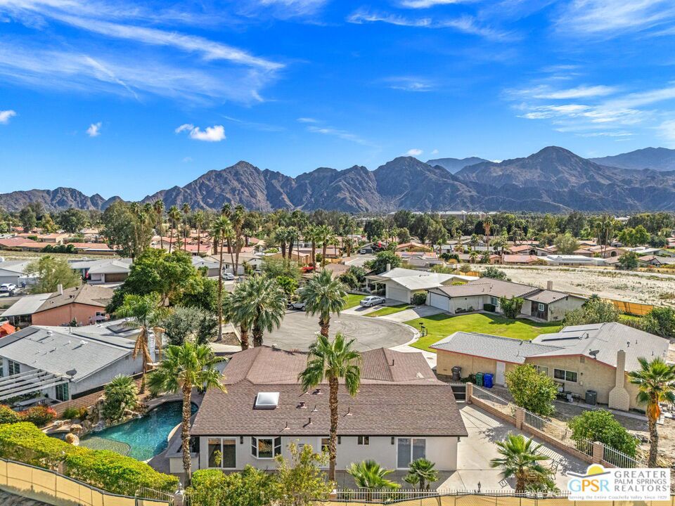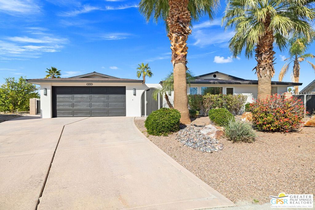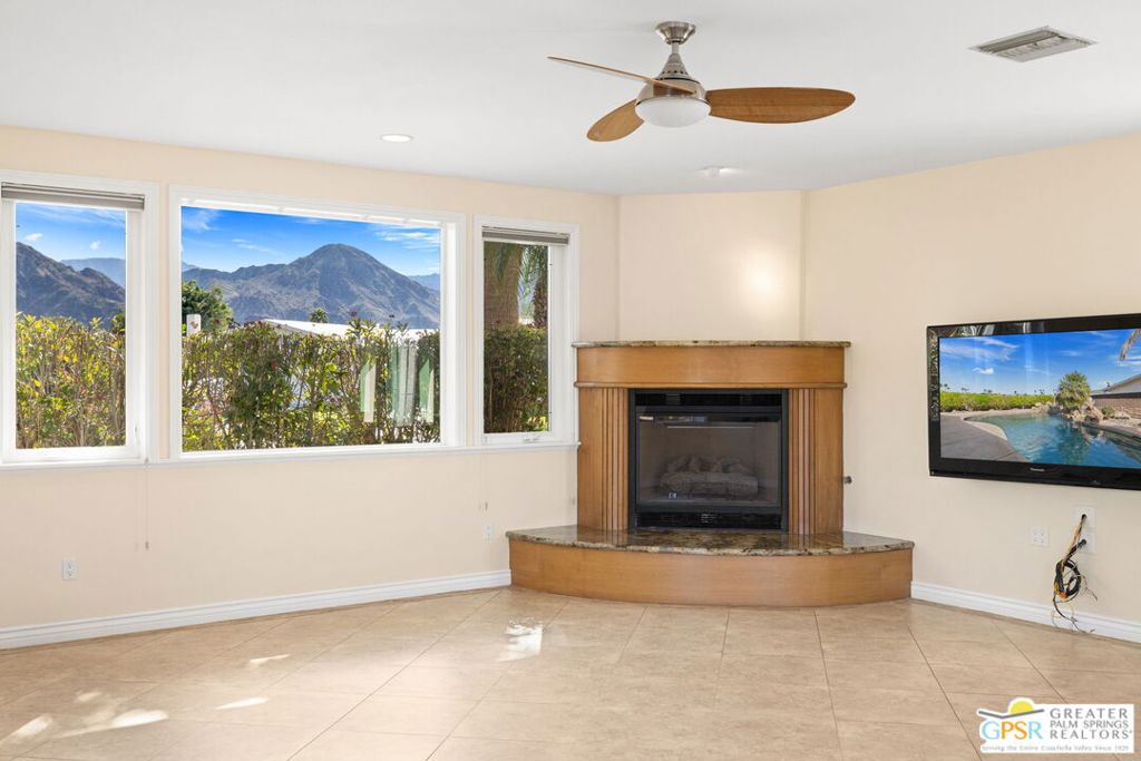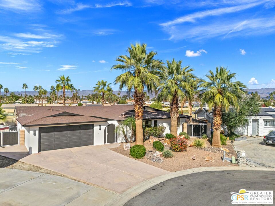 Exceptional value meets an A-plus location near Palm Desert Country Club. Tucked on a quiet cul-de-sac, this contemporary retreat is designed for the desert good life with three bedrooms, two baths, and a detached casita that elevate effortless indoor-outdoor living. A saltwater PebbleTec pool with cascading waterfalls, spa, and Baja-style sunning bench sets the tone, while the built-in barbecue with bar seating and TV makes entertaining easy. The hedged, walled, and gated backyard wraps around most of the home for privacy, complemented by desert-wise landscaping that keeps maintenance low. Inside, the layout flows beautifully with sliders opening to the pool terrace and handsome tile underfoot in the main living areas. A sunken living room anchored by a fireplace frames a striking view of Eisenhower Mountain. The kitchen shines with an oversized island, bay window, and skylight, while the dining area features a built-in buffet and cabinetry. The primary ensuite opens to the patio, guest bedrooms two and three share a full bath, and a utility room is positioned just off the kitchen. The detached casita opens directly to the pool and works beautifully as a guest retreat, office, or exercise space. Recent improvements include updated HVAC (2025), updated electrical panels, new interior paint, a tankless water heater, and newer pool equipment. Gas fire table included. Two-car garage plus gated RV parking. Adjacent green space behind the home, formerly the executive course at Palm Desert Country Club, is slated for villas as part of the Corterra 8 project.