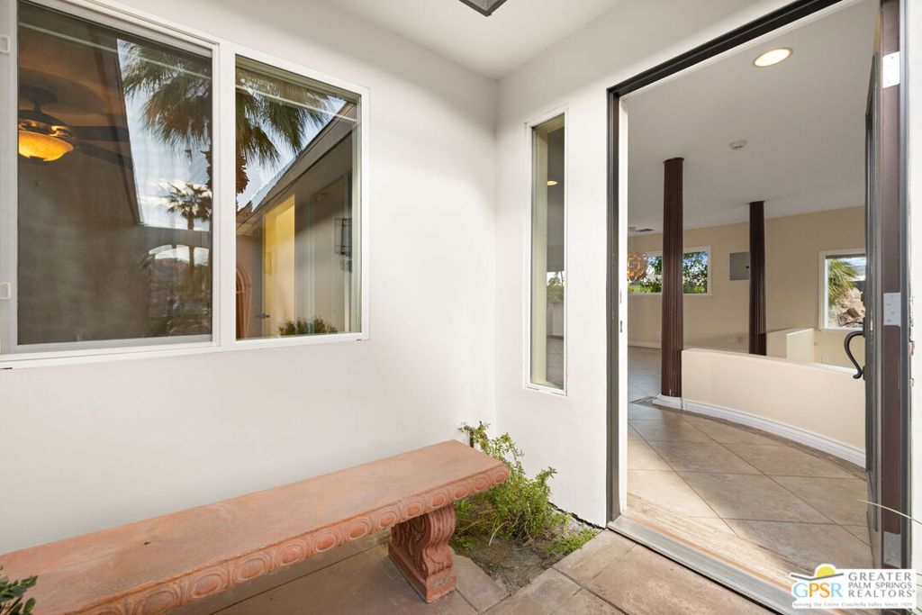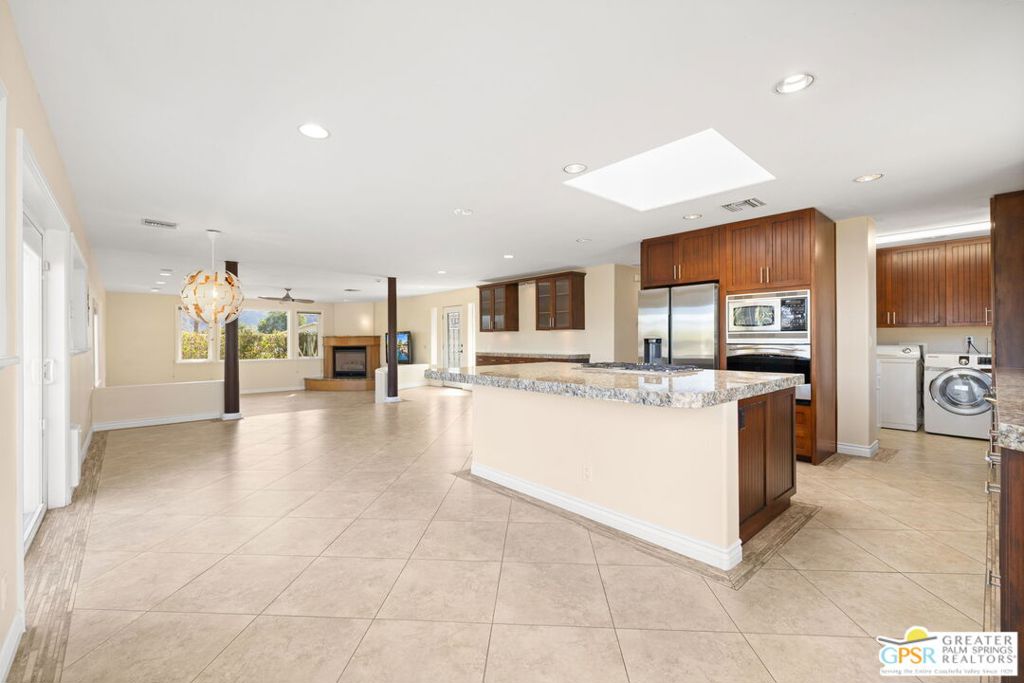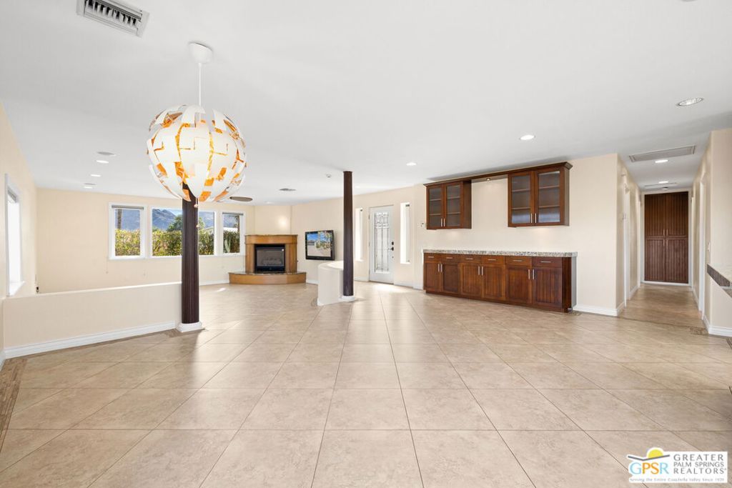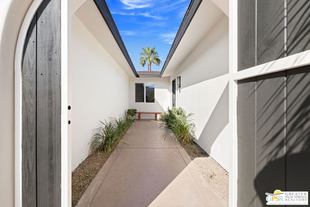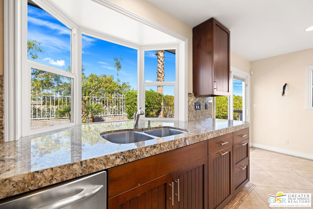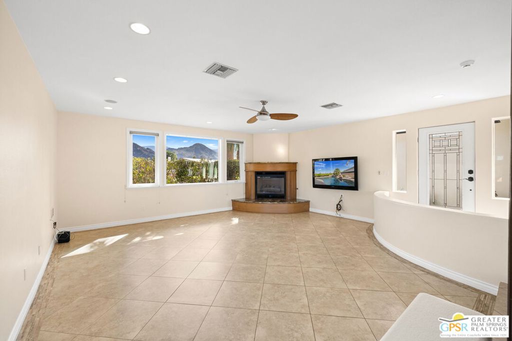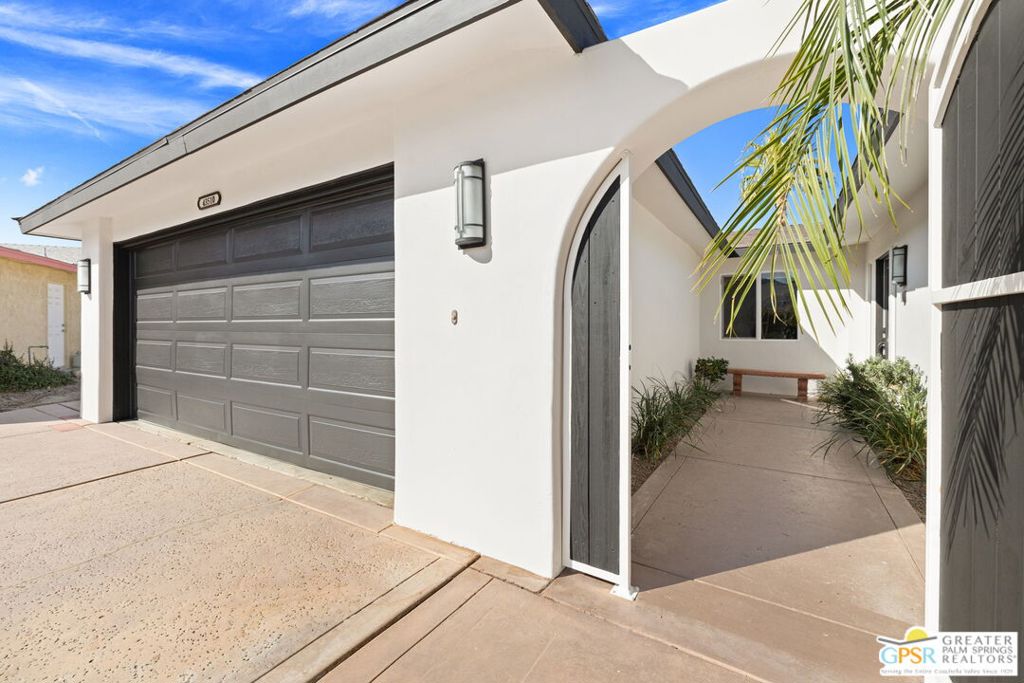 Exceptional value meets an A-plus location near Palm Desert Country Club. Tucked on a quiet cul-de-sac, this contemporary retreat is designed for the desert good life with three bedrooms, two baths, and a detached casita that elevate effortless indoor-outdoor living. A saltwater PebbleTec pool with cascading waterfalls, spa, and Baja-style sunning bench sets the tone, while the built-in barbecue with bar seating and TV makes entertaining easy. The hedged, walled, and gated backyard wraps around most of the home for privacy, complemented by desert-wise landscaping that keeps maintenance low. Inside, the layout flows beautifully with sliders opening to the pool terrace and handsome tile underfoot in the main living areas. A sunken living room anchored by a fireplace frames a striking view of Eisenhower Mountain. The kitchen shines with an oversized island, bay window, and skylight, while the dining area features a built-in buffet and cabinetry. The primary ensuite opens to the patio, guest bedrooms two and three share a full bath, and a utility room is positioned just off the kitchen. The detached casita opens directly to the pool and works beautifully as a guest retreat, office, or exercise space. Recent improvements include updated HVAC (2025), updated electrical panels, new interior paint, a tankless water heater, and newer pool equipment. Gas fire table included. Two-car garage plus gated RV parking. Adjacent green space behind the home, formerly the executive course at Palm Desert Country Club, is slated for villas as part of the Corterra 8 project.