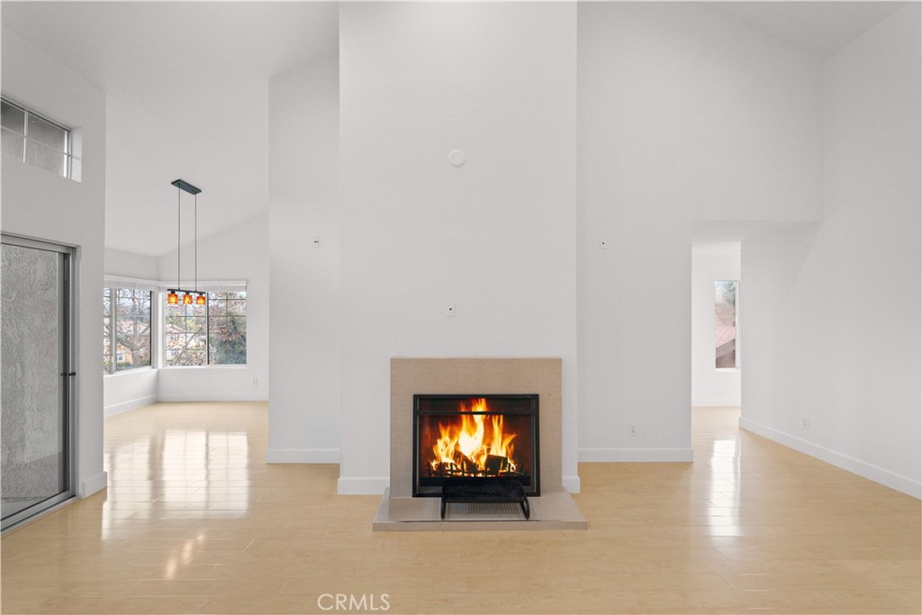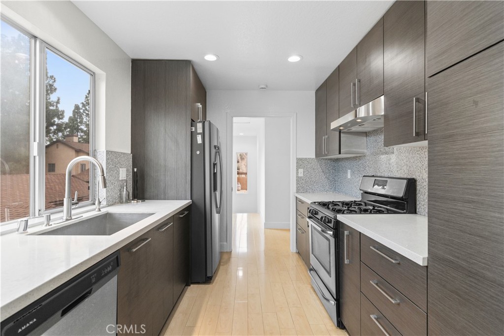 Welcome to this bright and well-maintained end-unit home in West Covina, offering 3 bedrooms, 2 full bathrooms, and approximately 1,502 sq ft of comfortable living space. Featuring high vaulted ceilings and abundant natural light, the open layout feels spacious and inviting. The spacious living area showcases warm wood flooring, recessed lighting, and a modern fireplace, creating an inviting space for both everyday living and entertaining. Two private patio terraces overlook mature trees and tranquil greenbelt views—perfect for relaxing or hosting guests? The remodeled kitchen offers sleek cabinetry, quartz countertops, stainless steel appliances, and a contemporary mosaic tile backsplash. A large window fills the kitchen with natural light and opens seamlessly to the dining area, making it ideal for gatherings and family meals. Bathrooms have been tastefully upgraded with modern vanities, quartz countertops, designer lighting, and glass-enclosed showers with stylish tile finishes. Clean lines and neutral tones create a relaxing, spa-like atmosphere. Additional highlights include updated flooring throughout, modern fixtures, ample storage, and a thoughtful layout that balances openness with privacy. The home has been recently refreshed with interior paint, lighting updates, and features a newer AC system and water heater, offering added peace of mind and making the property truly move-in ready. Residents enjoy access to resort-style HOA amenities, including a swimming pool, spa, and beautifully landscaped grounds. Additional conveniences include an upstairs laundry and storage room and two attached garage spaces. Conveniently located close to schools, shopping centers, dining, parks, and hiking trails, this home offers an excellent combination of comfort, functionality, and location—ideal for both homeowners and investors alike.