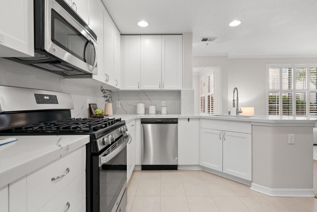 Located within the gated Miraval Community of Santa Clara, this rare first-floor end unit offers a sophisticated sanctuary with direct poolside access. The beautiful interior features rich hardwood flooring and plantation shutters and fresh new paint throughout. The remodeled kitchen is finished with new Quartz countertops and modern touches, and a separate dining area with a contemporary chandelier adds style and functionality. Distinguishing this residence is an expansive wrap-around patio that provides a private, resort-like retreat just steps from the sparkling community pool and spa. The thoughtful layout includes two spacious bedrooms with peaceful pool views, in-unit laundry, and the added convenience of two reserved parking spots with access to EV charging. Residents enjoy a true luxury lifestyle with exclusive amenities such as a swimming pool, spa, gym, clubhouse, and movie theater. Conveniently located near Rivermark Plaza, parks, trails, and major tech employers such as NVIDIA, Intel, Google, Apple, and Oracle, with easy access to Highways, and Google shuttle bus stop right outside the community.