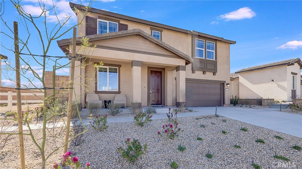 NEW CONSTRUCTION! This new two-story home is host to a spacious and flexible open-concept layout on the first floor, with a nearby covered patio offering seamless outdoor entertainment and leisure. A secondary bedroom is tucked away into a private rear corner near a full-sized bathroom. A versatile loft is located at the top of the stairs near two additional secondary bedrooms and the luxurious owner’s suite. The kitchen features new caledonia granite countertops and white cabinetry. Ara is a new collection of brand-new single-family homes for sale at the Skyborne masterplan to Desert Hot Springs, CA. The community features fantastic onsite amenities with the added benefit of a low-HOA, perfect for first-time homebuyers. Golf Cart Tours are available to view the new homes and the Skyborne amenities. Nearby cities offer plenty of options for shopping, dining and entertainment, with trendy Palm Springs being just 10 minutes away. Nature lovers will love being just an hour’s drive from the world-famous Joshua Tree National Park.