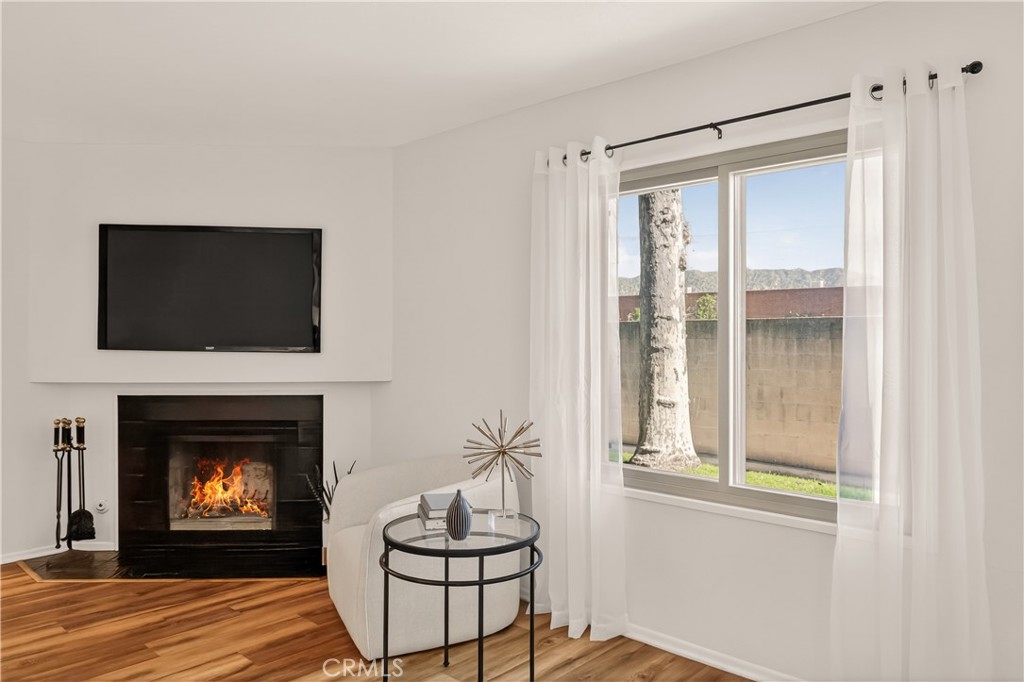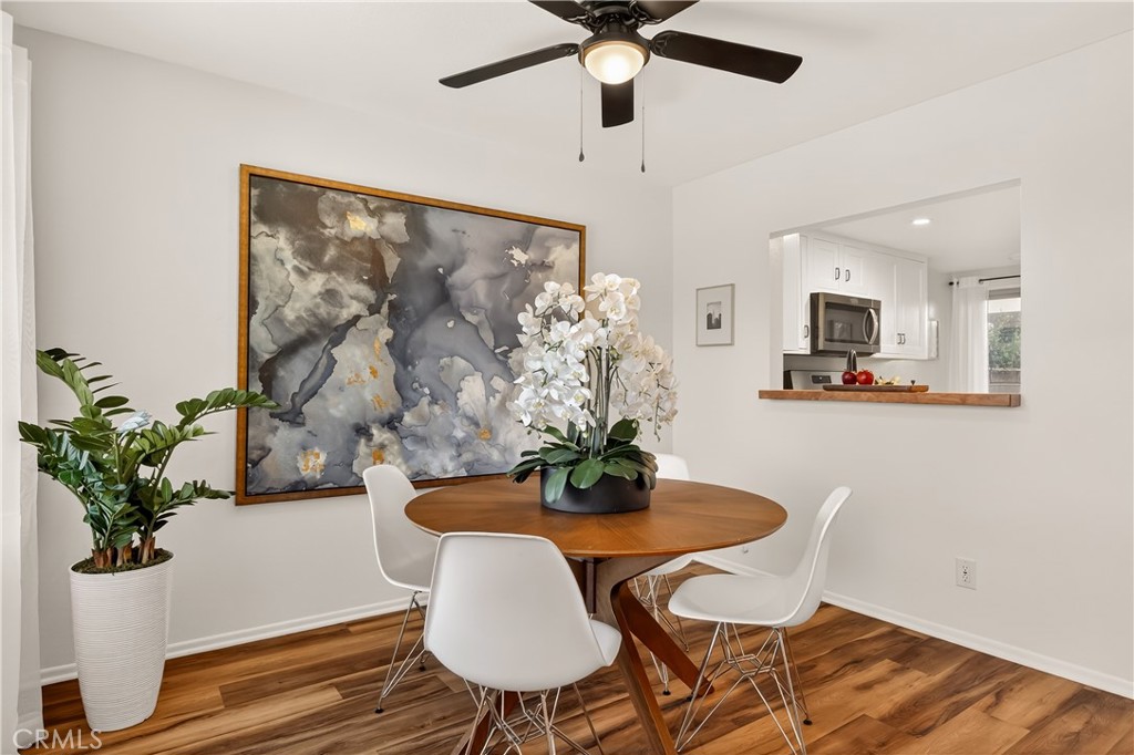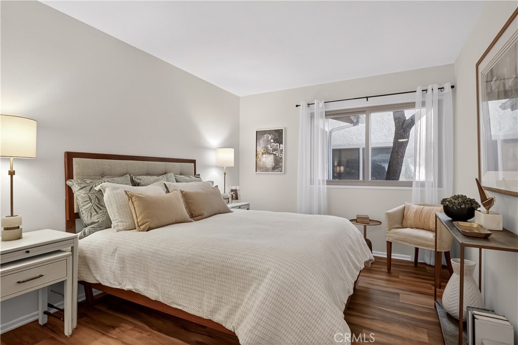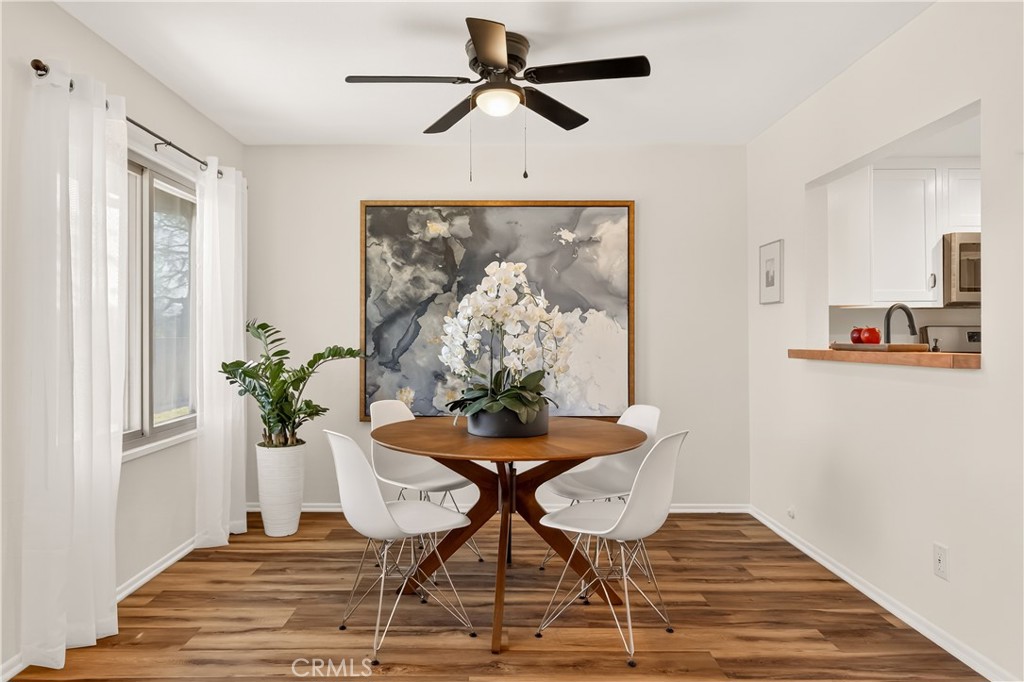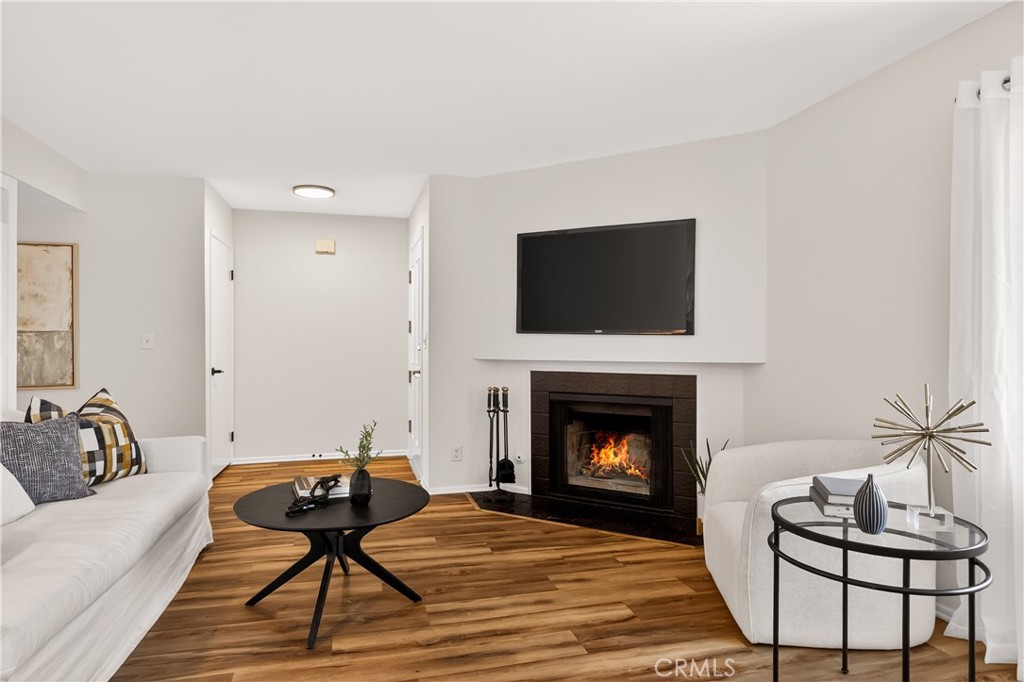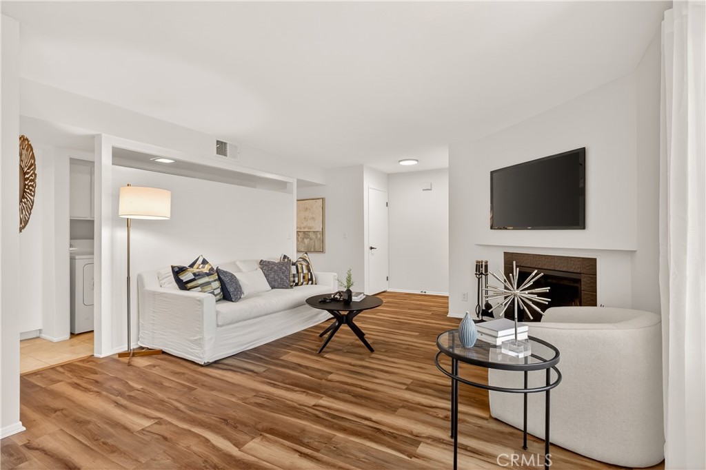 As you enter the home you are immediately welcomed by wood floors throughout, a romantic fireplace, eastern facing windows, and a perfect size dining area. The kitchen, complete with butcher block countertops, white shaker style cabinets, and a breakfast nook also has an open counter area making this a great place to entertain friends and/or family. As you head towards the back of the unit you pass the washer dryer closet. Down the hall you find the guest bath on your right with ample counter space on the vanity and a shower-tub combo. Across the hall is the guest bedroom. At the end of the hallway you find the primary suite complete with his and hers closets and a patio area off the bedroom. This wonderful community comes with a pool and hot tub, a single garage spot, as well as a second covered parking spot. If you are looking for an adorable home at a great value then this is a must see.